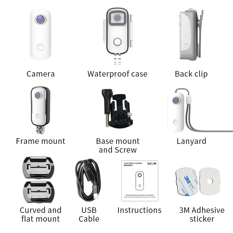 - 1 x Camera, 1 x Waterproof Case, 1 x Back Clip, 1 x Frame Mount, 1 x Base Mount, 1 x Screw, 1 x Lanyard, 1 x Curved and Flat Mount, 1 x USB Cable, 2 x 3M Adhesive Sticker