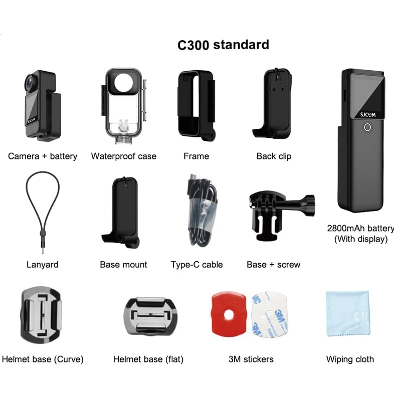 - 1 * Action Camera 1 * Battery Module 1 * Waterproof Case 1 * Frame Mount 1 * Base Back Clip 1 * Back Clip 1 * Lanyard 1 * Base Mount 2 * Curved and Flat Mount 1 * Long Screw 2 * Adhesive Sticker 1 * USB Cable 1 * Wipe Cloth 1 * Users Manual(English & Chinese)