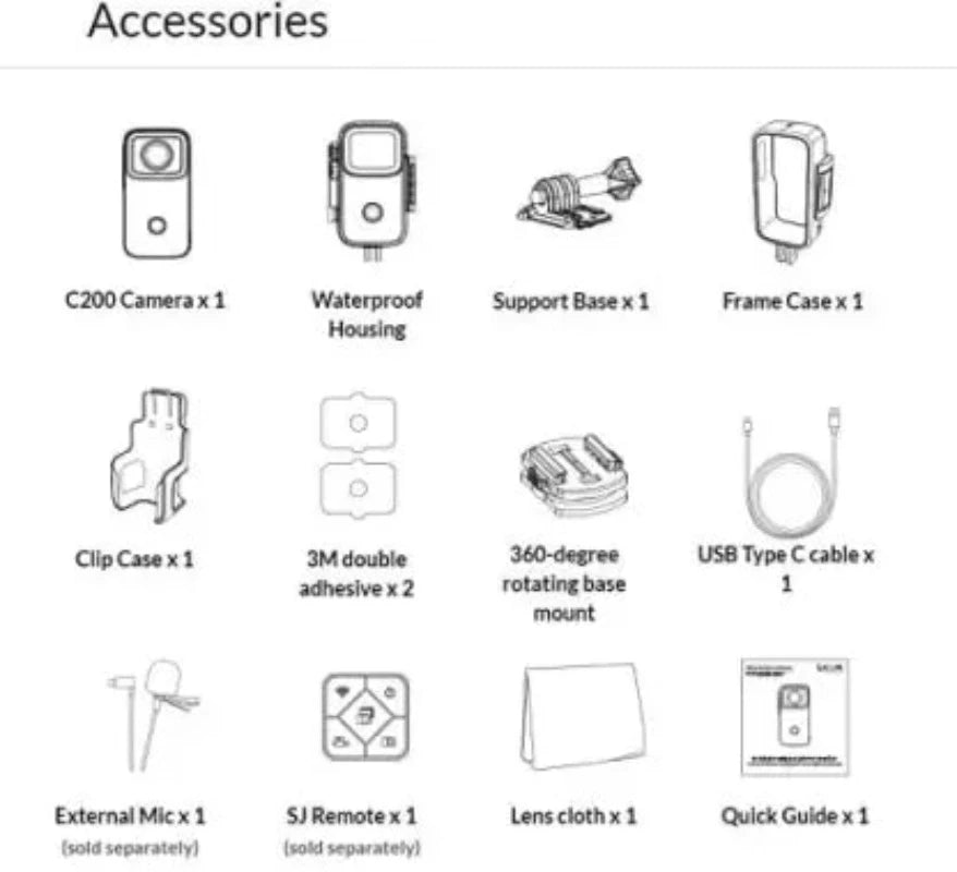 - 1 x Camera, 1 x Waterproof Case, 1 x Back Clip, 1 x Frame Mount, 1 x Base Mount, 1 x Screw, 1 x Curved and Flat Mount, 1 x USB Cable, 2 x 3M Adhesive Sticker, 1 x Wipe Cloth, 1 x Manual